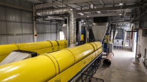 A linha de produção abrange diferentes etapas, iniciando pelo recebimento do resíduo sólido até a produção do Composto Biossintético Industrial (CBSI), combustível utilizado para a produção de energia. Ao chegarem à Unidade de Recuperação Energética, os resíduos são armazenados em uma antessala e, posteriormente, passam por uma esteira com equipamento que abre os sacos e separa os metais automaticamente, de forma magnética. Em seguida, os resíduos são destinados ao triturador, que reduz o tamanho do material para facilitar o processo. O próximo passo é o secador, que reduz a umidade do material aproveitando o calor da caldeira.