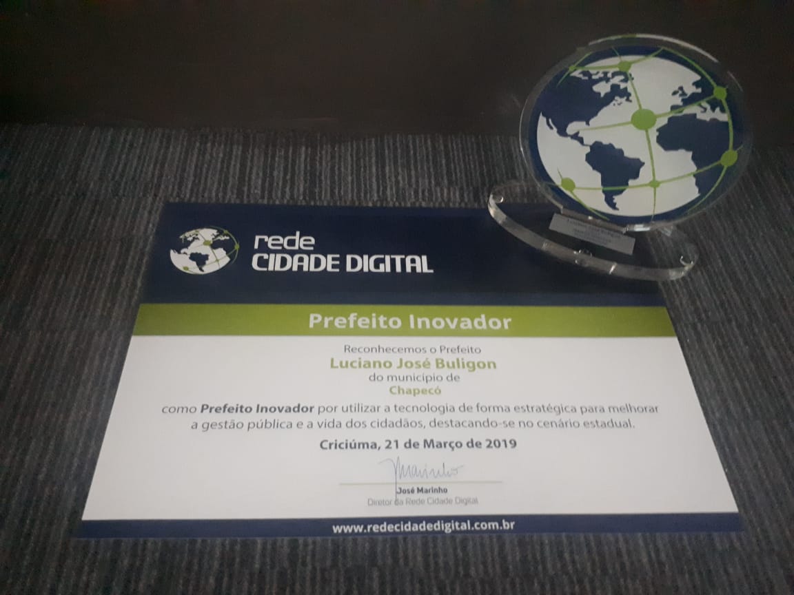 O Prefeito de Chapecó, Luciano Buligon, foi premiado na manhã de hoje como um dos Prefeitos Inovadores de Santa Catarina, durante a cerimônia do 4º Congresso Catarinense de Cidades Digitais, realizado na Associação Empresarial de Criciúma (ACIC) no Sul do Estado.
