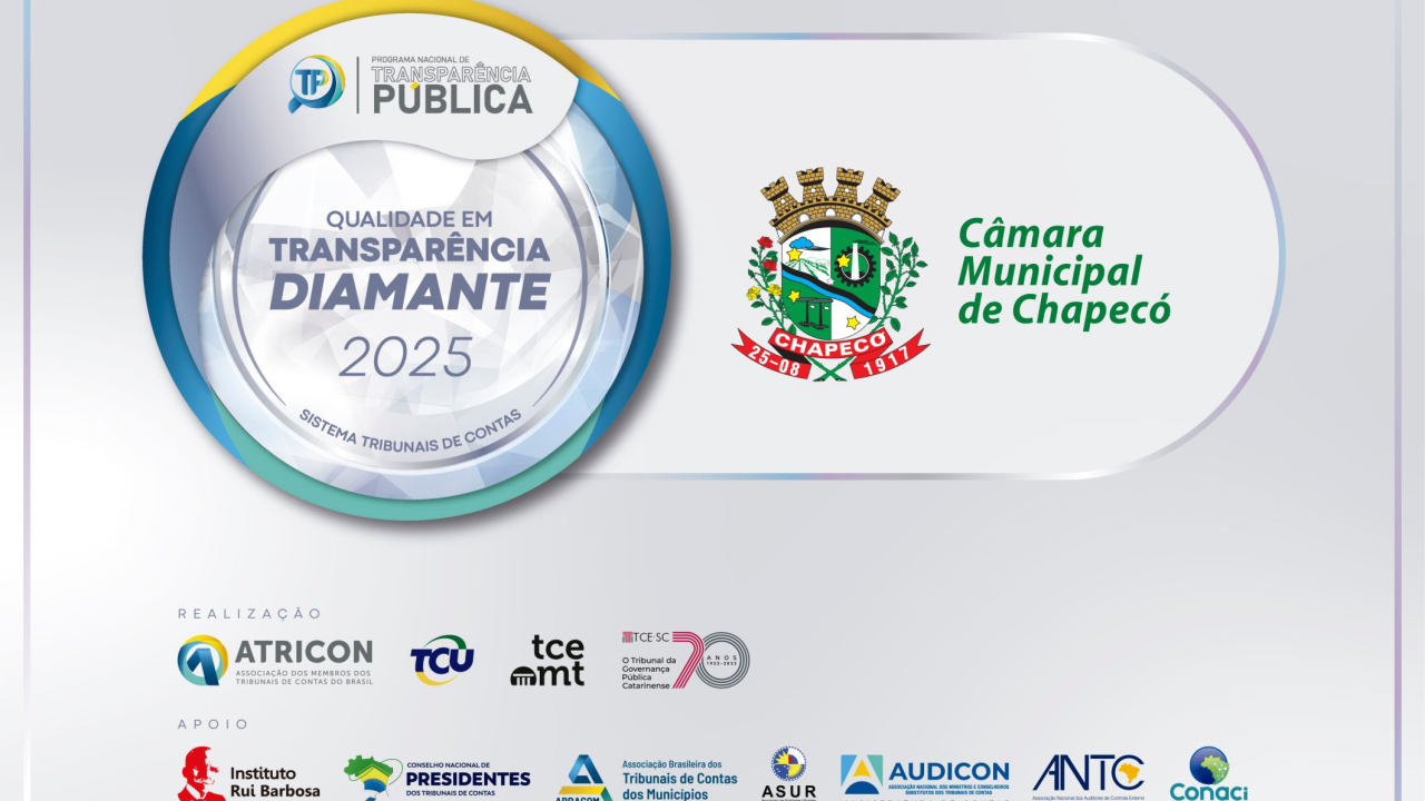 A Câmara Municipal de Chapecó foi reconhecida, pelo segundo ano consecutivo, com o Selo Diamante de Transparência Pública, a mais alta certificação concedida pelo Programa Nacional de Transparência Pública (PNTP), liderado pela Atricon – Associação dos Membros dos Tribunais de Contas do Brasil.