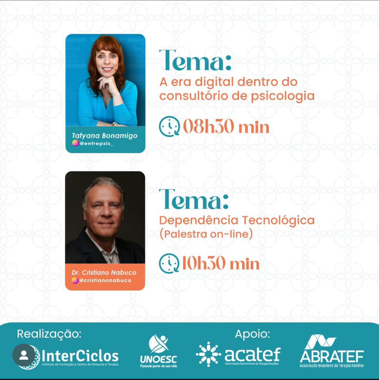 Pensando em debater os desafios desse tema que ocorre, neste sábado, das 8h às 17h30, no auditório da Unoesc Chapecó, o 2º Ciclo de palestras Interciclos, com o tema “Famílias e Era Digital”, organizado pelo Instituto de Formação e Centro de Pesquisas e Terapia (Interciclos) e a Unoesc Chapecó, com apoio também é da Associação Catarinense de Terapia Familiar (ACATEF) e Associação Brasileira de Terapia Familiar (ABRATEF).