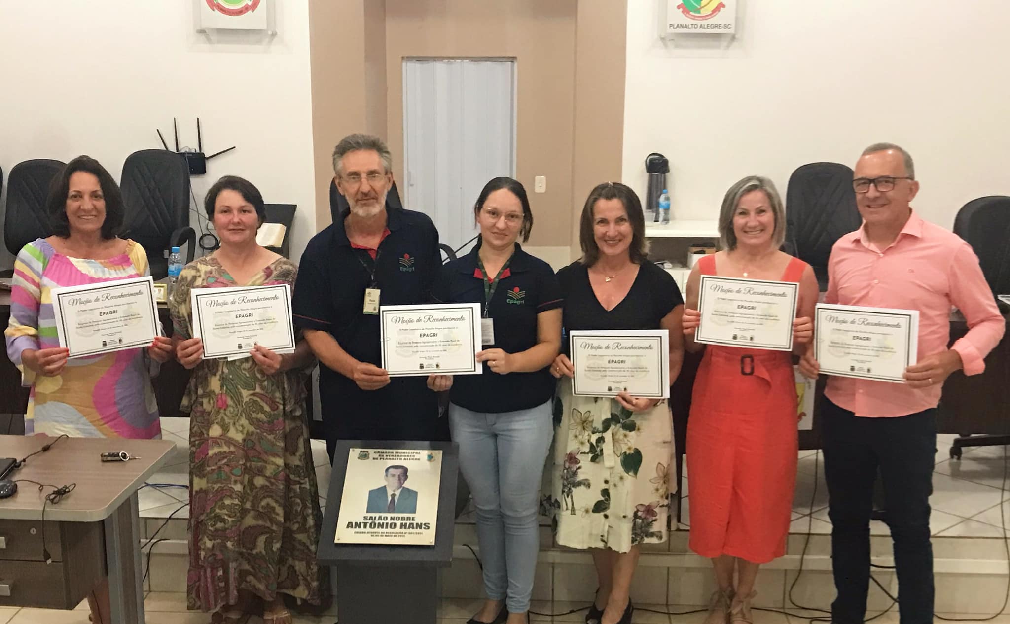Com iniciativa do Poder Legislativo, os profissionais homenageados no ato foram a Engenheira Agrônoma Extensionista Angela Maria Sendeski, a Engenheira Agrônoma e ExtencionistaAngela Daniela Taffarel, o Técnico em Agropecuária IvanorSfreddo, a Extensionista Social Ivete Teresinha TrichesChiarello, a Engenheira Agrônoma Marlene Boniatti e representando o Escritório Local da Epagri de Planalto Alegre a Auxiliar Administrativa Elisandra GirardeloFilippi e o Engenheiro Agrônomo Paulo Ricardo Ficagna.