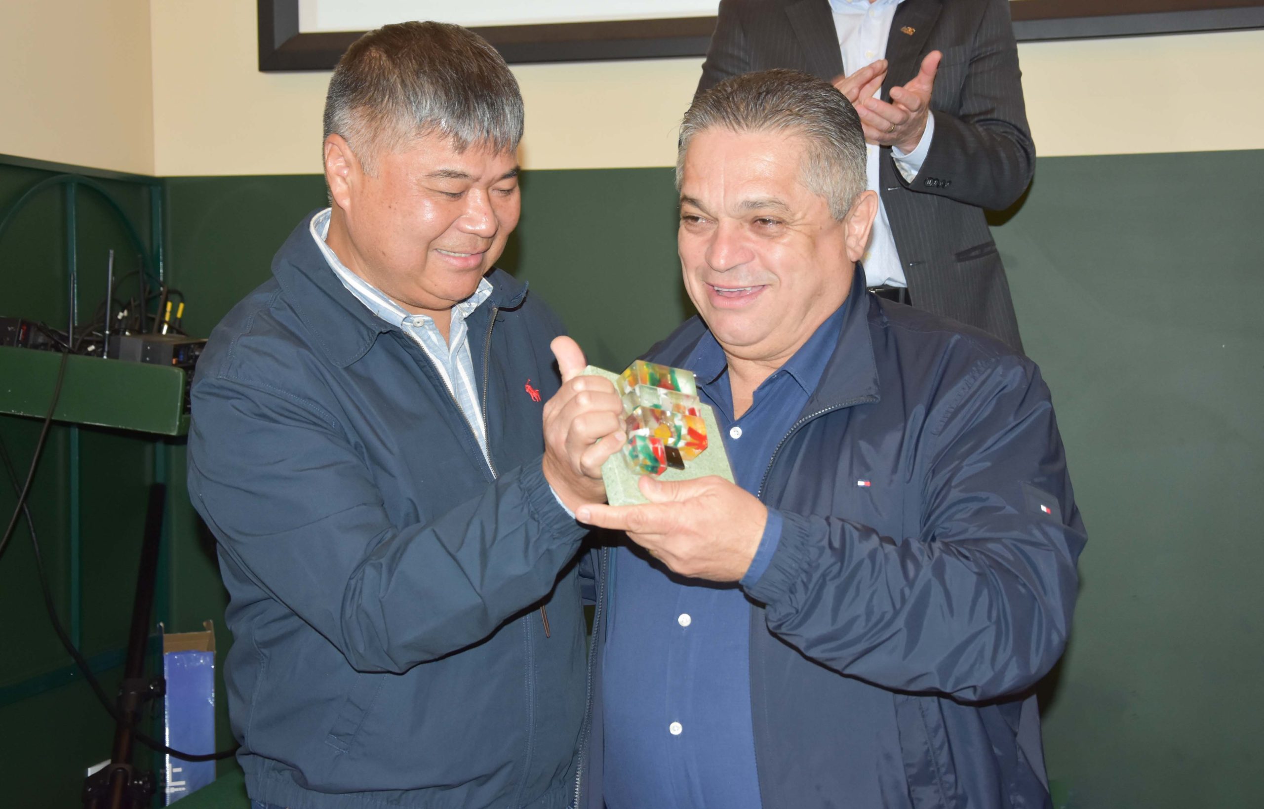 “Efapi 2023” é o nome da peça criada pelo artista plástico chapecoense Xico Bracht, entregue aos homenageados. Assentada em pedra de granito verde, a peça traz uma estilização do novo pavilhão. Confeccionados em resina transparente, tem em seu interior formas coloridas. A ideia é de uma vitrine que expõe os valores da terra.