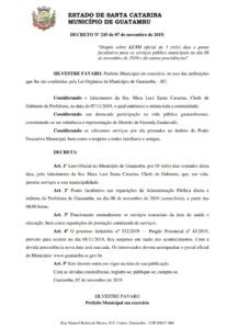 “Dispõe sobre LUTO oficial de 3 (três) dias e ponto facultativo para os serviços público municipais no dia 08 de novembro de 2019 e dá outras providências”