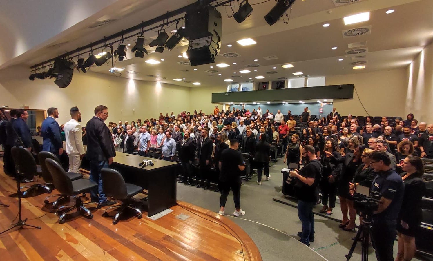 A mesa de autoridades foi formada por pelo autor da proposição, deputado Miotto, pelo deputado estadual Lucas Neves (Podemos), pelo presidente da Mais de Cristo, Valmor da Costa Batista, pelo pastor da Mais de Cristo, Paulo Mazarem, pelo secretário-adjunto da Secretaria de Estado da Administração Prisional e Sócio Educativa, Neuri Mantelli, e pelo prefeito de São José, Orvino Coelho de Ávila.