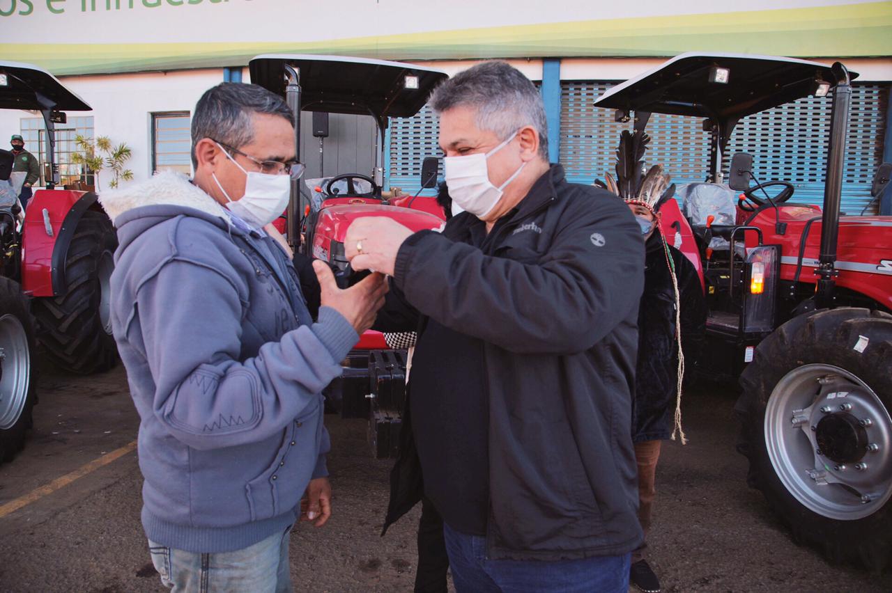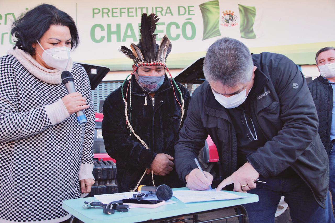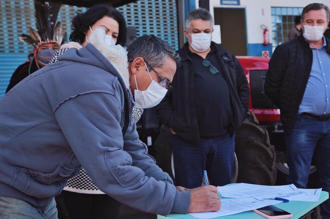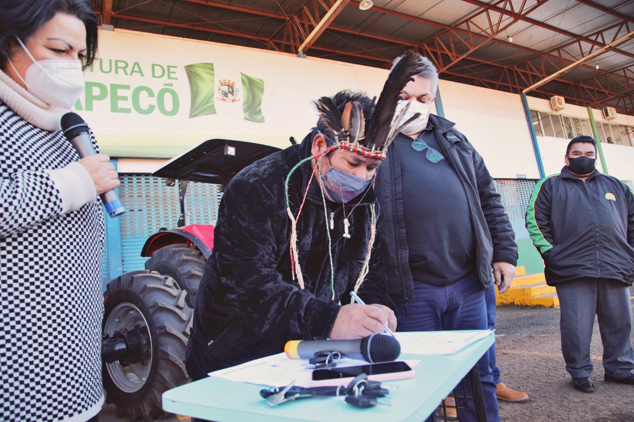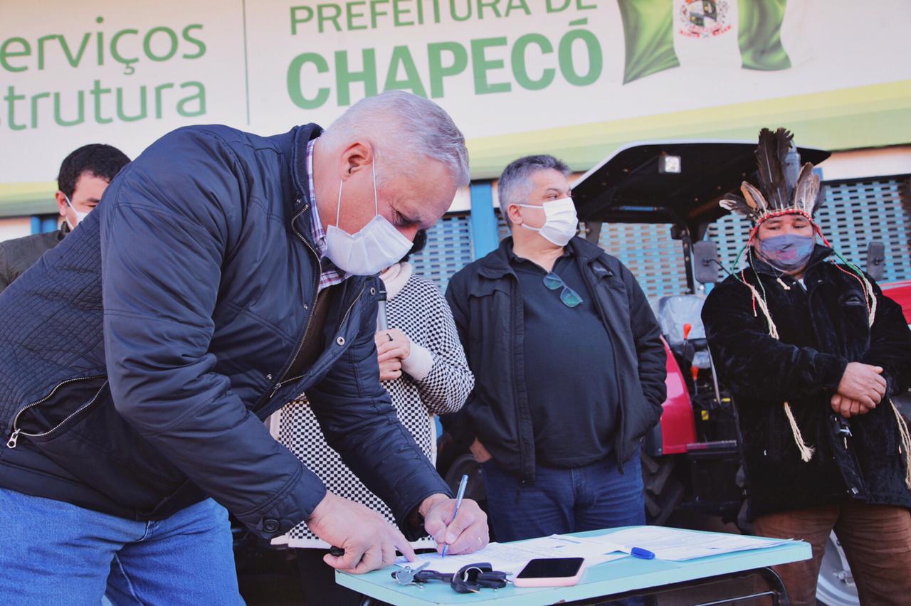 O prefeito de Chapecó, João Rodrigues, e o secretário da Infraestrutura, Luiz Paulo Carraro, participaram na manhã desta terça-feira do ato de entrega de quatro tratores da Funai para caciques das terras indígenas Kondá (Chapecó), Toldo Chimbangue (Chapecó), Toldo Pinhal (Seara) e Palmas (Palmas-PR).
