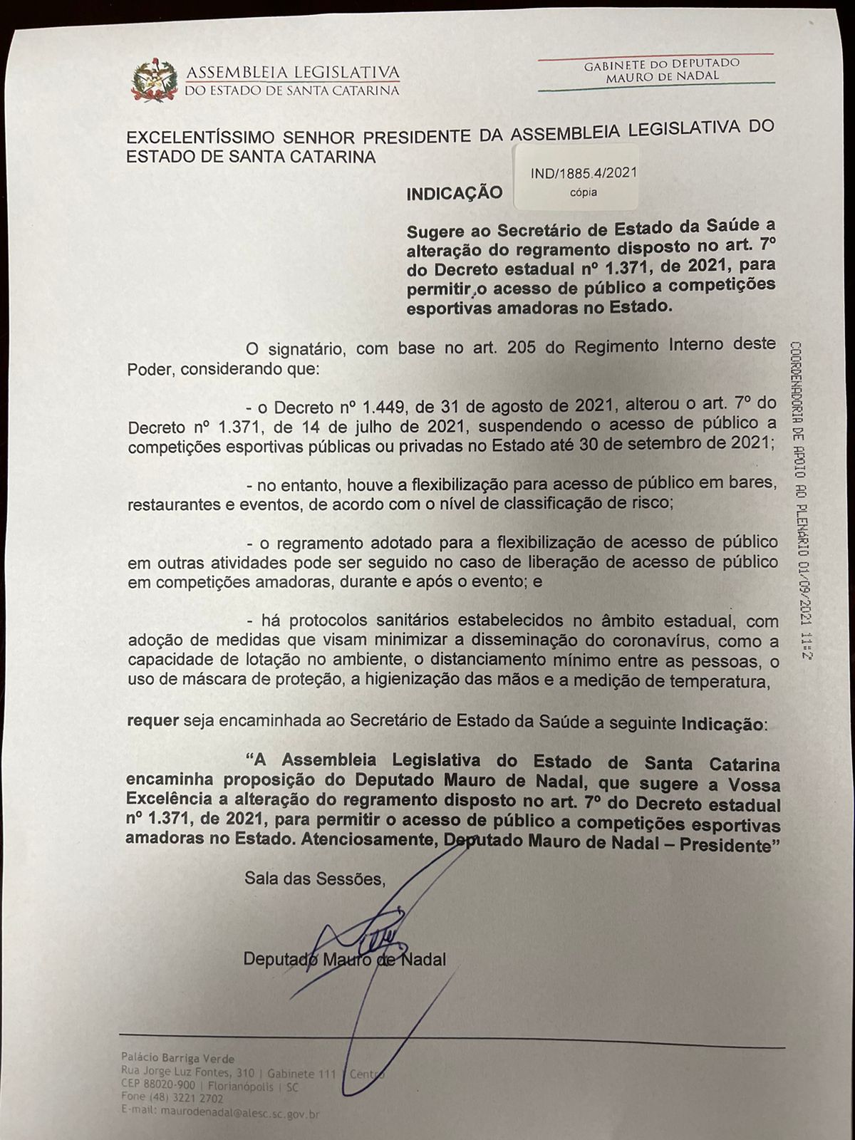 Após a publicação do novo decreto do governo do Estado que mantém a proibição de presença de público nos estádios de futebol e nas outras praças esportivas de SC, o presidente da Alesc, deputado Mauro De Nadal (MDB), protocolou, na manhã desta quarta-feira (1º), uma Indicação direcionada ao secretário de Estado da Saúde para alteração nas regras.