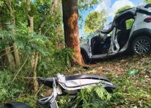 O veículo atingiu primeiro o Gol e, logo depois, colidiu violentamente contra uma árvore à beira da rodovia, ficando bastante destruído.