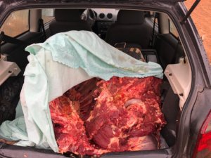 No interior do veículo, no porta malas foi encontrado carne bovina em grande quantidade, de possívelmente abigeato.