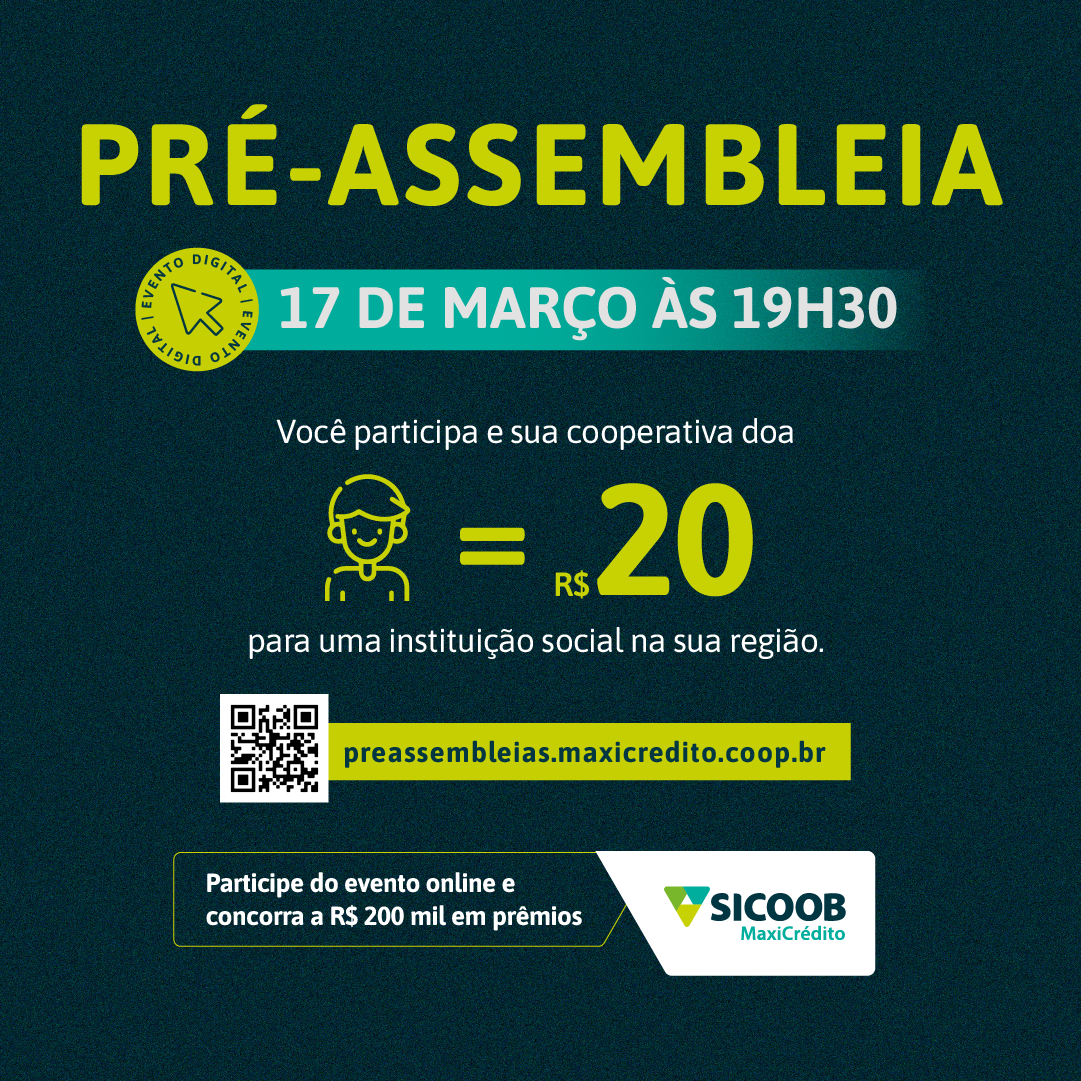 Para acompanhar a pré-assembleia, o cooperado deve se cadastrar no site www.preassembleias.maxicredito.coop.br. É neste mesmo endereço que o associado deverá entrar no dia 17 de março, para validar a participação e acessar o link para a transmissão ao vivo.