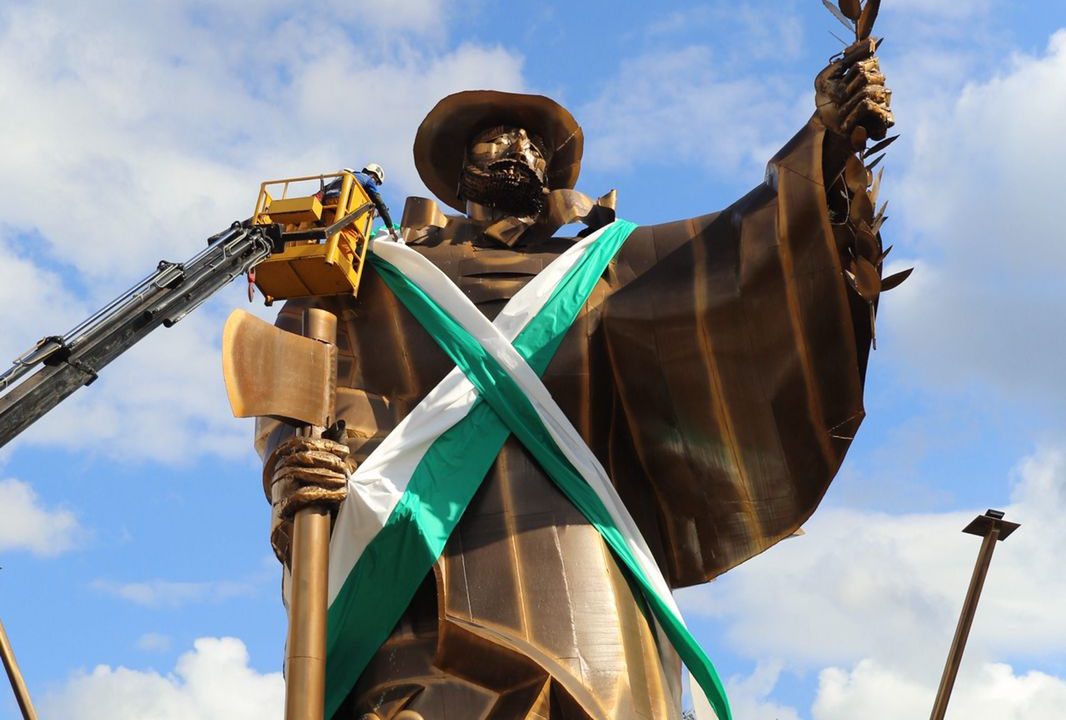 A Prefeitura de Chapecó decorou nesta terça-feira (18) o monumento O Desbravador, com faixas nas cores verde e branca.