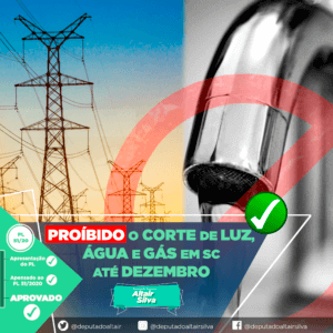 A proposta do deputado Altair Silva (Progressistas) de proibir o corte de água, luz e gás em Santa Catarina durante a pandemia, foi aprovada na Assembleia Legislativa, com o prazo prorrogado até 31 de dezembro, quando vigora o estado de calamidade pública. Durante a terceira sessão virtual extraordinária, realizada na tarde desta quarta-feira (25), outras medidas para fazer frente a propagação do novo coronavírus (Covid-19) e auxiliar a saúde pública, foram aprovadas em sua redação final e agora seguem para a sanção do governador.