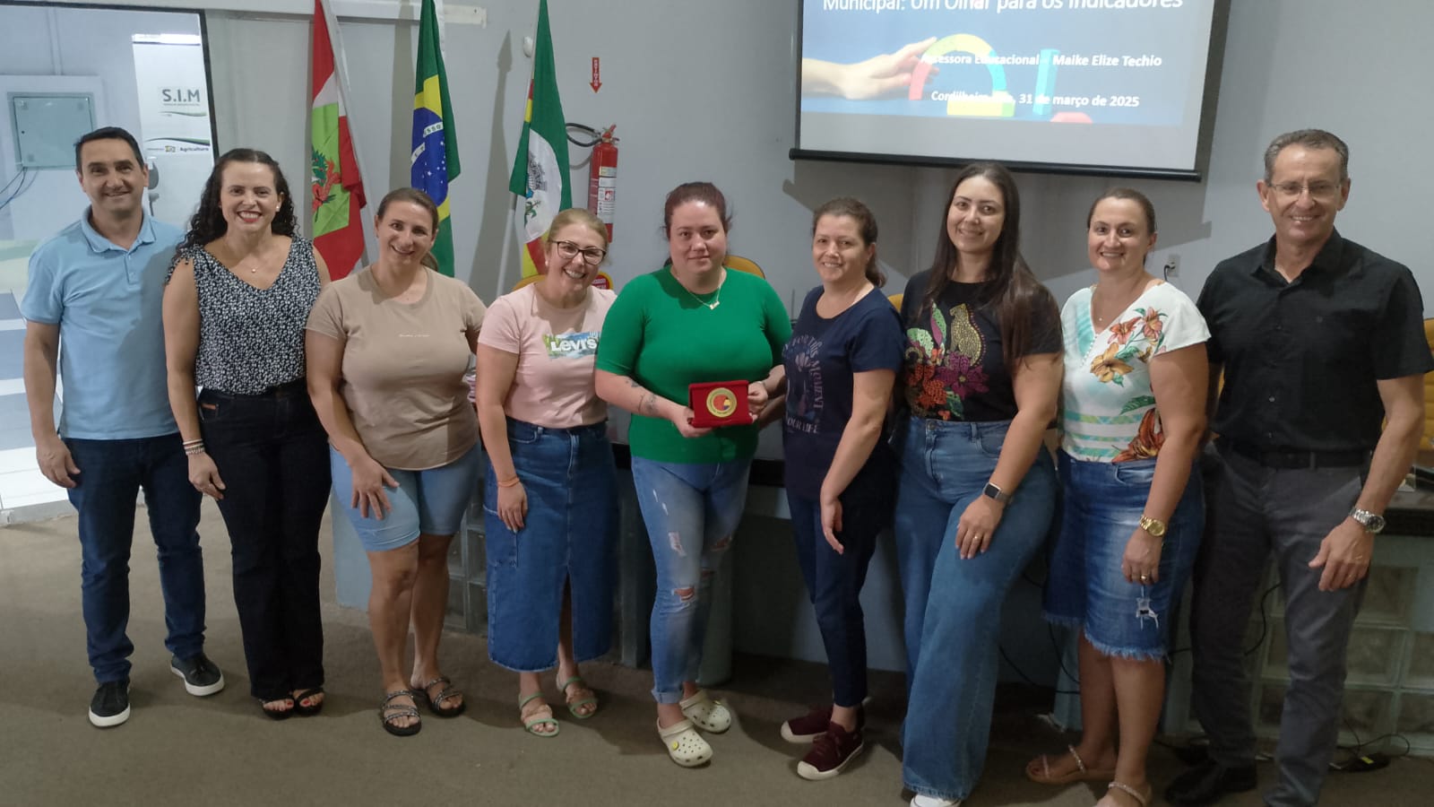 Após a roda de conversa, os professores participaram de uma palestra conduzida pela Assessora Educacional, Maike Elize Techio, que abordou os desafios e as oportunidades na educação municipal, apresentando indicadores e políticas públicas de incentivo à educação.