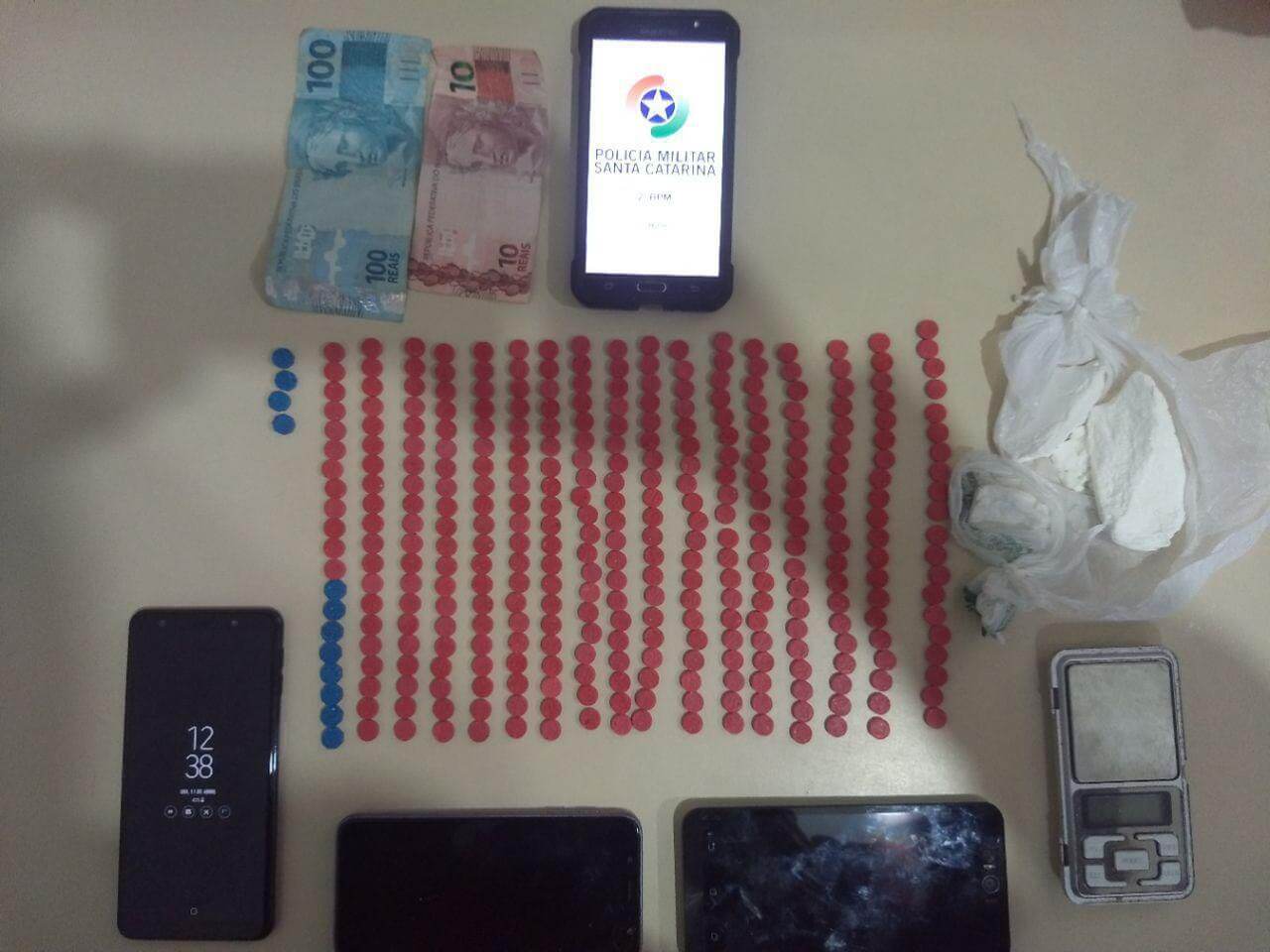 Guarnições da Polícia Militar de Chapecó, após uma denúncia registrada na Central Regional, de Emergências (CRE), prendeu um Homem de 18 anos por tráfico e apreendeu 344 (trezentos e quarenta e quatro) comprimidos de ecstasy e 82 (oitenta e duas) gramas de cocaína, além de quantidade considerável de dinheiro.